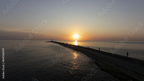 © Oleg, Fototapeta premium The sun sets over the water; people stand at pier's edge, watching it descend