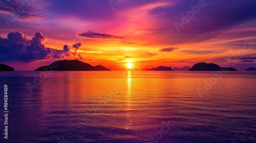 Naklejka premium The sun setting behind distant islands on a calm sea, with the colorful...