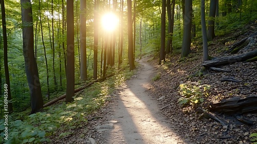 © Solihin, Obraz premium The sun shines brightly over a forest trail through the trees