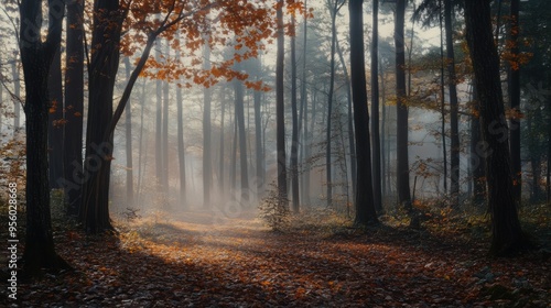 © Sergey, Fototapeta premium The sun shines brightly through trees in the foggy forest