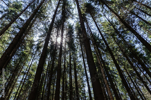 © yunava1, Obraz premium The sun shines through the crown of pines