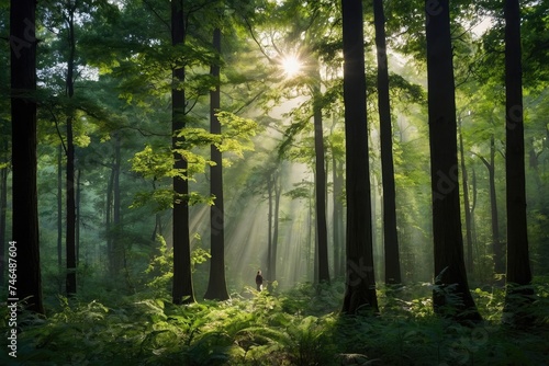 © Arman, Naklejka premium the sun shines through the trees in the forest, japan lush forest, forest ray light, peaceful lushious forest, lush forest, beautiful forest.