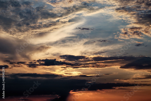 © Oleksii, Fototapeta premium The sun shining through scattered clouds at sunset.