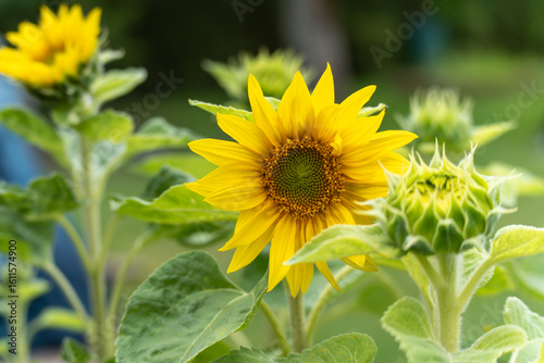 © Jakob, Fototapeta premium The sunflower is in the center, surrounded by other buds. The image exudes brightness and naturalness.