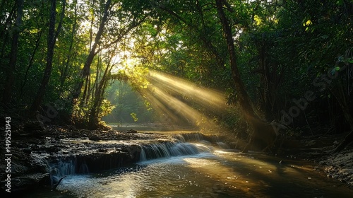 © Roun Sreylak, Obraz premium The sunlight breaking through the trees, casting a warm glow over the stream that runs from Haew Suwat Waterfall.