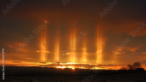 © Justlight, Fototapeta premium The suns last farewell creates a stunning display of solar pillars against the evening sky.