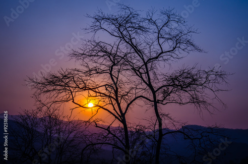 © sutthipong, Fototapeta premium The sunset over the mountains, with trees silhouetted against the sky