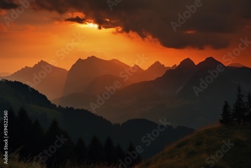 © SANGHYUN, Obraz premium The sunset sky and the mountains in Switzerland. AI generative