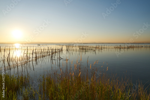 © Photoderox, Fototapeta premium the sunset with fishing nets on a lake