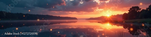 © Atittaya, Fototapeta premium The surface of a calm lake glistens in the soft glow of falling golden stars, serene, field, sunset