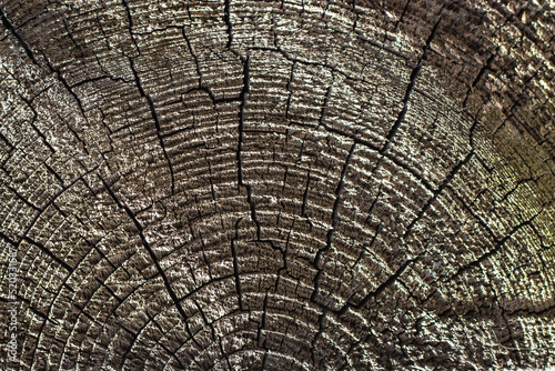 © eliosdnepr, Fototapeta premium The surface of an old cracked tree stump with a small deep four-rayed slit in the center and wavy growth rings