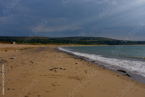Obraz premium The sweeping beach at Oxwich Bay on a dark summer morning.