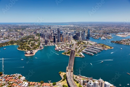 © Wirestock, Fototapeta premium the sydney skyline taken from above the city, with the yarra bridge in the