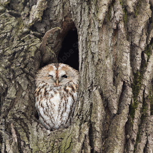 Obraz premium The tawny owl (Strix aluco) in a nest hollow