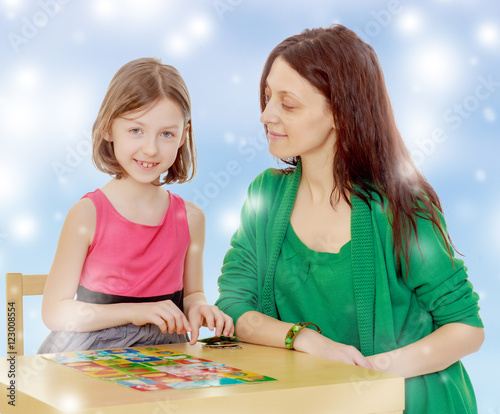 Fototapeta premium The teacher and the girl at the table studying the cards