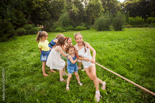 © oksix, Obraz premium The team of girls are playing a tug of war
