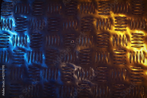© Никита Федонников, Obraz premium The texture of corrugated metal illuminated by blue and yellow spotlights