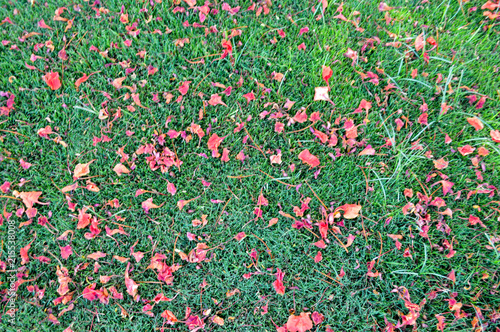 © Bolbik, Fototapeta premium The texture of green fresh mown trimmed smooth natural bright grass, English lawn fields and scattered petals of red flowers. The background