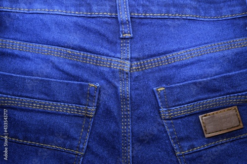 Fototapeta premium The texture of modern blue denim cloth. Dark jeans background with thin seams and a large pocket.