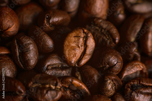 Fototapeta premium The texture of roasted coffee beans. Macro image