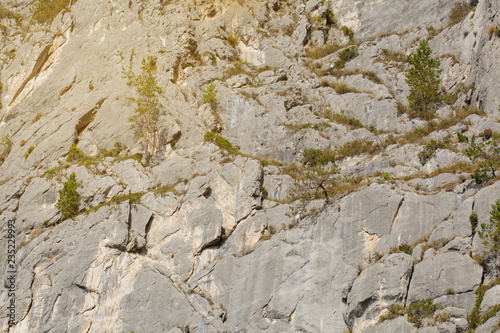 © Yugan, Fototapeta premium The texture of the stone on the rock in Sunny weather. Coniferous trees grow on the rocks. Green vegetation on the stone surface. The Altai mountains.
