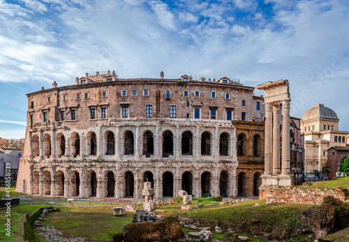 Fototapeta premium The Theatre of Marcellus, an ancient open-air theatre in Rome, Italy, built in the closing years of the Roman Republic. The ruins of Temple of Apollo Palatinus are on the right.