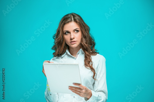 © master1305, Fototapeta premium The thoughtful young business woman with pen and tablet for notes on blue background