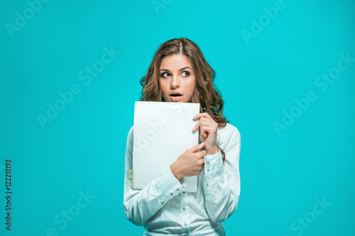 © master1305, Fototapeta premium The thoughtful young business woman with pen and tablet for notes on blue background