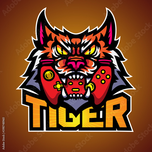© ziiinvn, Obraz premium The tiger bite a game pad, Mascot logo vector illustration.