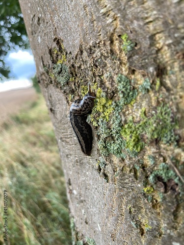 © karegg, Obraz premium the tiger slug crawls along a tree