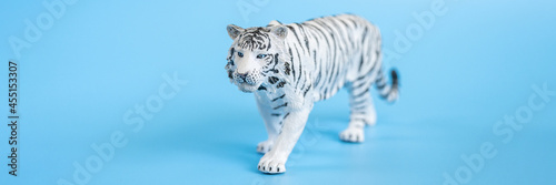 Naklejka premium the tiger, symbol of 2022 year. plastic white toy figure tiger on a blue background. banner