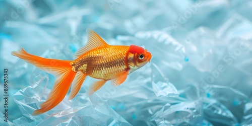 Naklejka premium The title "An orange goldfish swimming among plastic waste symbolizing...