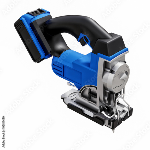 Naklejka premium The tool is a blue electric jigsaw on a white isolated background. 3d rendering.
