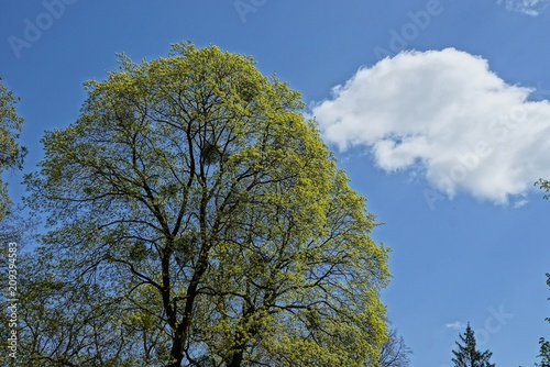 © butus, Obraz premium the top of a green tree against the sky and clouds