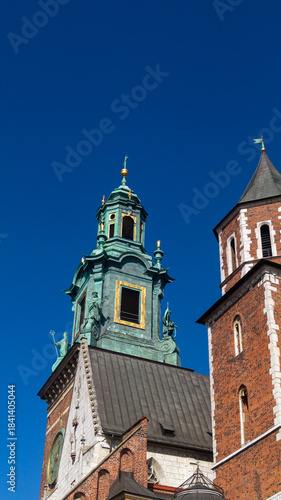 © mikus, Obraz premium The top of the tower is green. The top of the castle is made of orange bricks against a blue sky background.