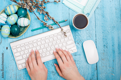 © master1305, Naklejka premium The top view of easter on wooden table office workplace
