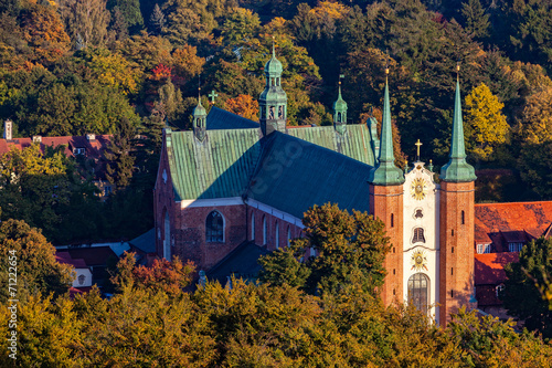 Fototapeta premium The top view of Oliwa Cathedral in autumn scenery, Poland