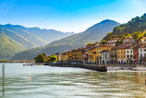 Naklejka premium The town of Domaso, on Lake Como, on a summer day.