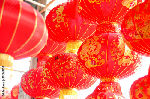 Naklejka premium The traditional Chinese red lanterns hanging for the Lunar New Year.Year of...