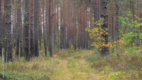 Fototapeta premium The trail in the forest. Autumn pine forest.
