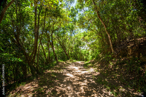Naklejka premium The trail through the green forest in the mountains of Pingtung, Taiwan.