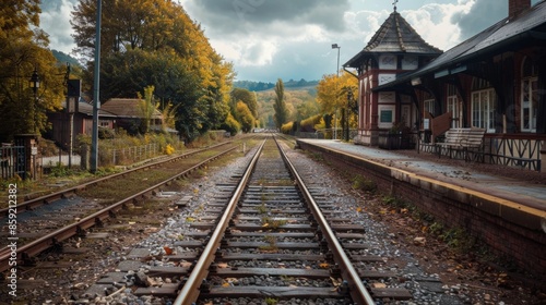 © Justlight, Fototapeta premium The train stopping at a quaint station allowing passengers to explore and take photos.