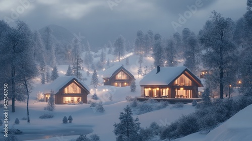 © Ti Studio, Naklejka premium The tranquil and snowy landscape of Ningle Terrace, with warm lights shining from the cabins.