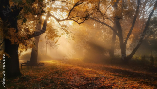 Fototapeta premium The tranquil autumn forest glows with vibrant gold sunlight generated by AI