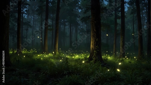Fototapeta premium The tranquil glow of fireflies in a dense, impenetrable forest ai_generated
