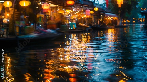 Obraz premium The tranquil riverside bazaar is transformed into a whimsical realm as the reflections of lanterns and floating stalls are blurred in the defocused water. .