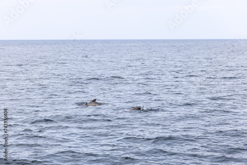 Obraz premium The tranquil seas near Andenes are momentarily stirred by a pilot whale family, elegantly traversing the waters of the Lofoten Islands.