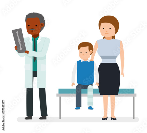 © AyhaanA, Obraz premium The traumatologist. The boy broke his leg, sitting on the couch with his mother. Leg plastered. Doctor looking at an x-ray. Vector illustration in a flat style