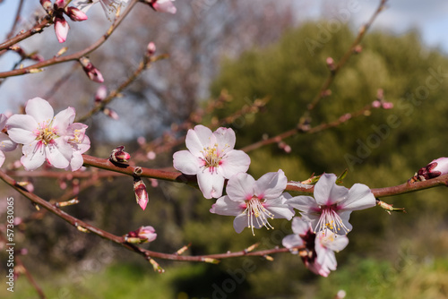 © Natalia S., Fototapeta premium The tree is a blooming almond with white flowers. Early spring. Selective focus