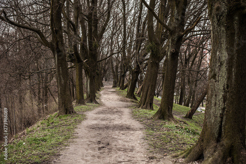 © katafree, Obraz premium The trodden path in a mysterious mystical place and the tall old trees